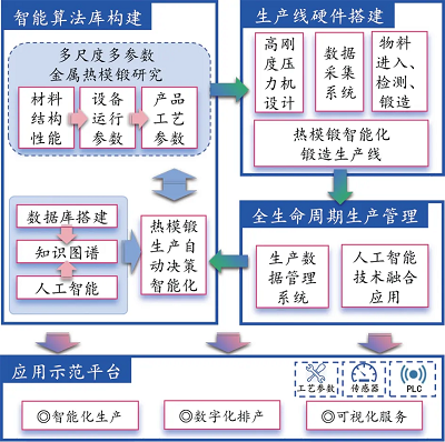 總體上看,國外智能化設(shè)備及系統(tǒng)比國內(nèi)先進(jìn), 國內(nèi)雖然在智能化設(shè)備上取得了一定的進(jìn)步,但在智能化系統(tǒng)上還尚未建立完整的、大型的數(shù)據(jù)庫,軟件開發(fā)也處于起步階段,與國外差距較大。順應(yīng)上述需求,需要面向特定鍛造領(lǐng)域針對其中的智能化生產(chǎn)系統(tǒng)與服務(wù)平臺中的關(guān)鍵問題開展相關(guān)研究。本項(xiàng)目目 標(biāo)是搭建面向汽車熱模鍛行業(yè)的智能化鍛造系統(tǒng)與開放創(chuàng)新服務(wù)平臺,并進(jìn)行應(yīng)用示范,智能化鍛造系統(tǒng)總體架構(gòu)如圖1所示。