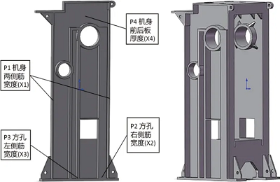 借助機(jī)身殼模型的拓?fù)鋬?yōu)化概念構(gòu)型,以及機(jī)身結(jié)構(gòu)的應(yīng)力分布,我們將機(jī)身還原為三維實(shí)體模型進(jìn)行如圖4所示的結(jié)構(gòu)改造,在機(jī)身方孔和曲軸支撐孔兩側(cè)材料分布最為密集之處依照最優(yōu)拓?fù)錁?gòu)型設(shè)置寬度為P2和P3的支撐筋:在機(jī)身設(shè)計(jì)區(qū)域兩側(cè)和方孔上端設(shè)置寬度為P1的支撐筋,設(shè)計(jì)域前后側(cè)面設(shè)置板厚為P4。對比優(yōu)化后在Abaqus軟件中獲得的壓力機(jī)機(jī)身最大相對位移量與粒子群優(yōu)化得到的目標(biāo)函數(shù)值可知,兩者相差0.58%.幾乎沒有多少差距,證明響應(yīng)面結(jié)合粒子群優(yōu)化獲得的設(shè)計(jì)變量參數(shù)數(shù)值是可靠的。