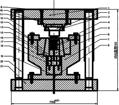鐘形罩?jǐn)D壓成形需要四套模具,各擠壓步驟模具結(jié)構(gòu)除凸凹模外基本相同。反擠壓是保證零件的尺寸精度和表面粗糙度的關(guān)鍵,擠壓時模具要承受一定的高壓,所以對反擠壓模具要求較高,設(shè)計(jì)圖如圖14所示。